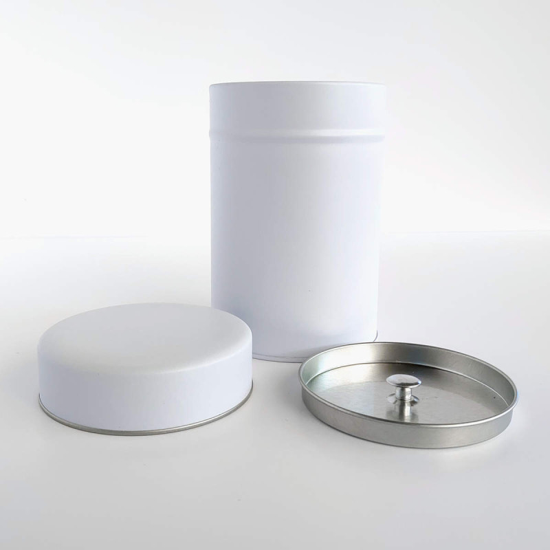 Boite à thé blanche en métal avec double couvercle.