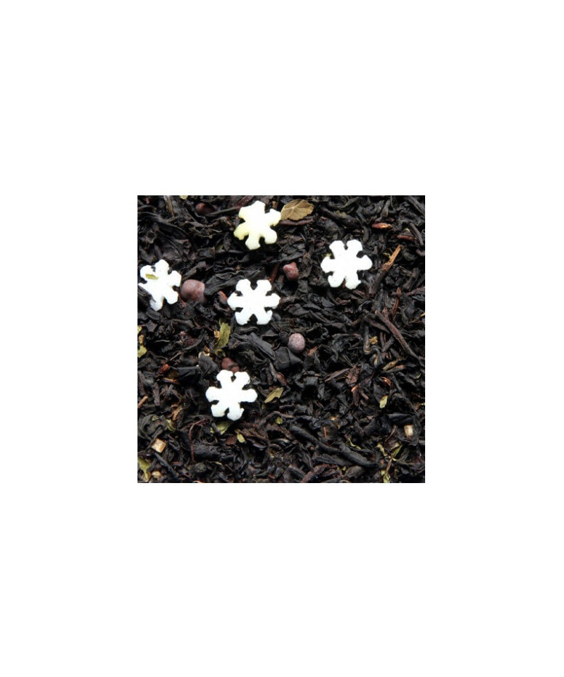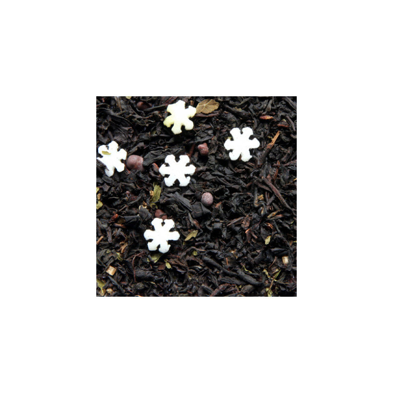 Thé noir de Chine non fumé aromatisé au chocolat et à la menthe avec des copeaux de chocolat et des feuilles de menthe ainsi que de joli petit flocons de neige en sucre.