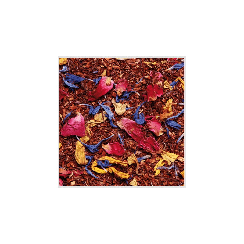 Rooibos* rouge d'Afrique du Sud aux arômes de vanille fraise et au pamplemousse, parsemé de pétales de tournesol et de bleuet.