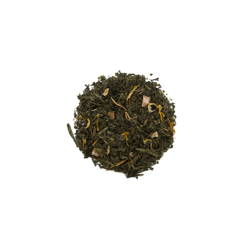 Thé vert Sencha de Chine aromatisé au melon et àla mangue, et parsemé de morceaux de fruits et de pétales d'hélianthe.