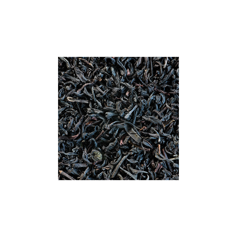 Thé noir de Chine fumé à l'aide de racines d'épicéa. Thé à large feuilles clair à la tasse.