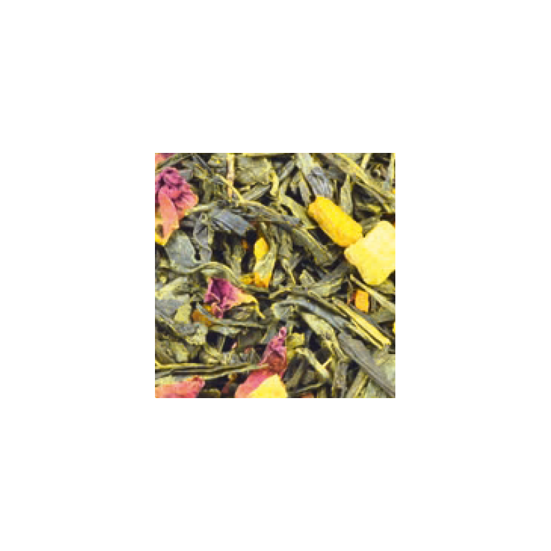 Thé vert de Chine non fumé aux arômes naturels de gingembre et ananas, agrémenté de morceaux de fruits et pétales de fleurs.