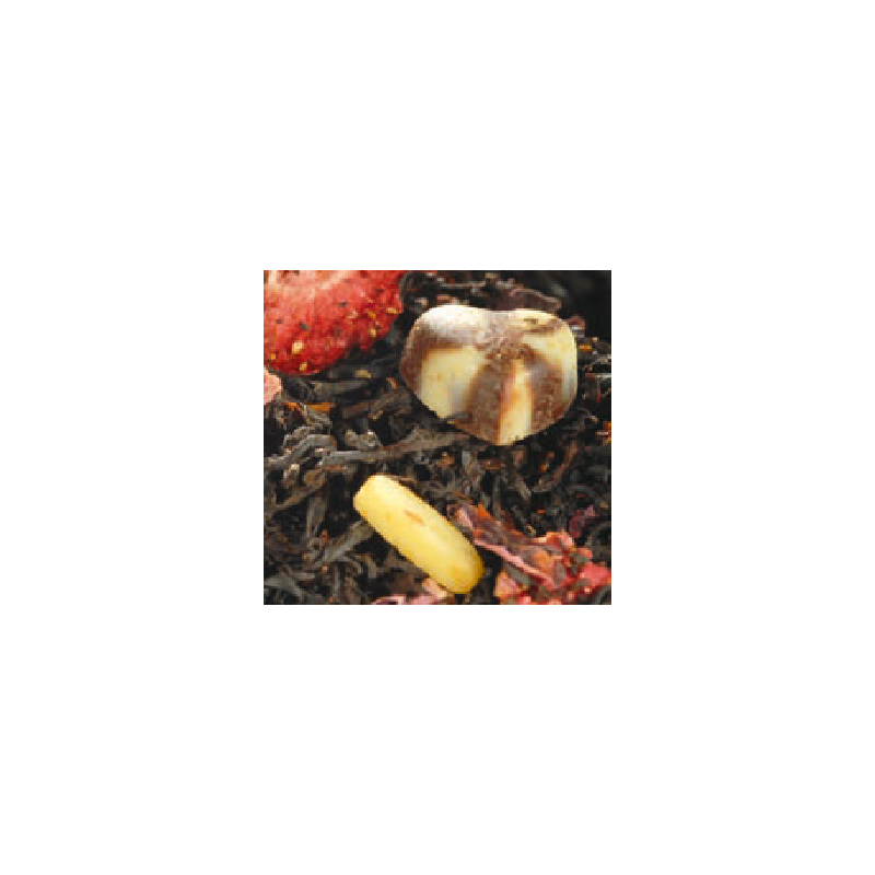 Thé noir de Chine non fumé aromatisé au chocolat noir et blanc, amande et fraise avec des morceaux de fruits et pétales de fleurs.