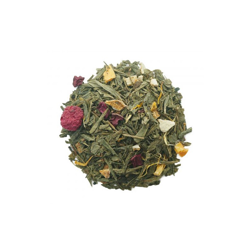 Thé vert China Sencha à feuilles entières aux arômes naturels d'Abricot et de Framboise et agrémenté d'écorces de citron et pétales de fleurs.
