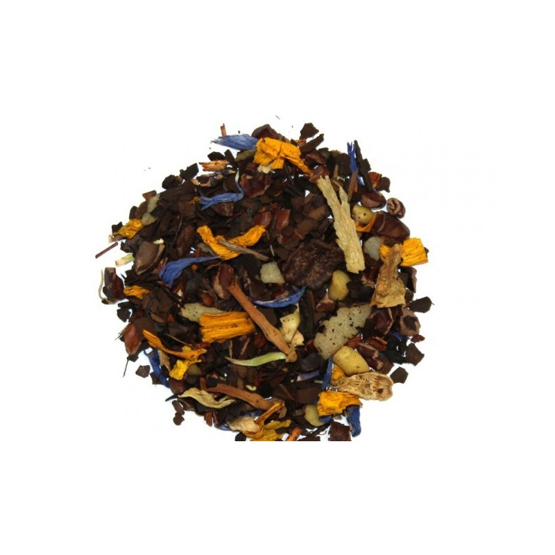 Mélange de maté grillé, éclats de fève de cacao, rooibos, pétales de tournesol, amandes, noix de coco et fleurs de bleuet. Arôme chocolat.