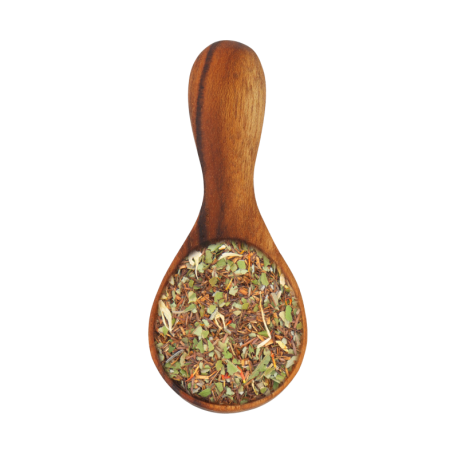 Le Rooibos* rouge d'Afrique du Sud associé à la myrte citronnée d'Australie donne une tasse acidulé et désaltérante.