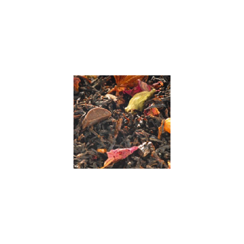 Thé noir aromatisé au chocolat avec des pépites de chocolat et agrémenté de raisins secs, cardamone, badiane, clou de girofle, vanille, cannelle et agrémenté d'écorces d'orange et pétales de roses.